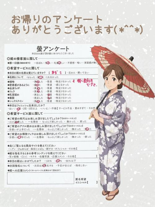 朝イチにお逢いした ☆ 初めまして様 ☆ 【 螢 】を選んでいただき ありがとうございました 色々なお話が聞けて 楽しかったです もう『特急あずさ』に乗って 着いているでしょか? ゆっくり休んでくださいね また機会がありましたら 仲良くしてください ☆ 螢 あずさ ☆ |